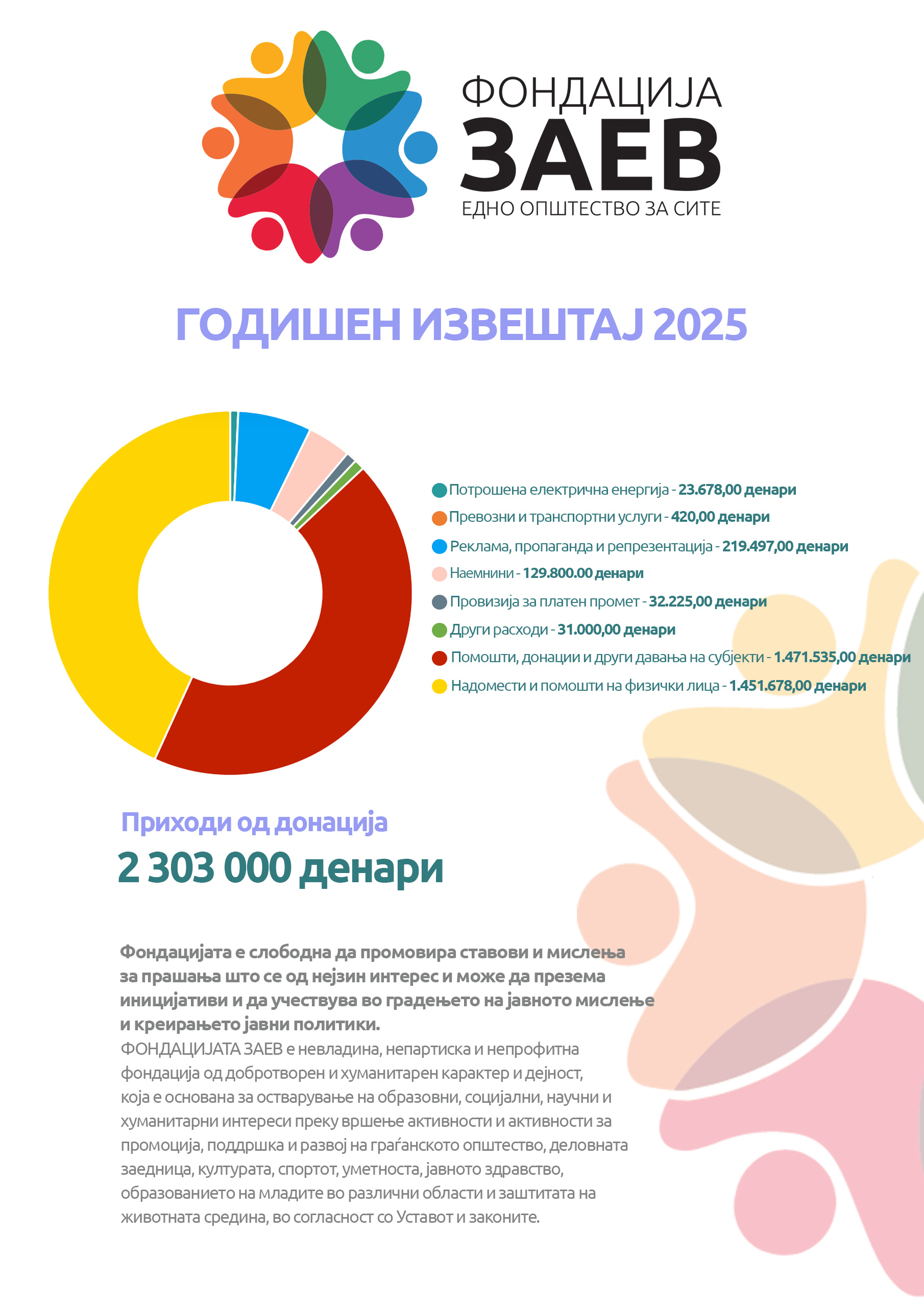 Чекорејќи низ просторот и времето, најважно од се е цврсто да верувате во мисијата и визијата кои сте ги избрале да ви бидат водилки низ животот, да знаете каде се наоѓа целта кон која се стремите и која е вистинската причина за таквиот ваш стремеж. Доколку се исполнети овие три предуслови, убеден сум дека патот за надградба на успешната себереализација е истиот тој пат по кој патува сонот до убавото јаве. Можеби во сето тоа мое видување лежи одговорот за успешното затворање на кругот на четвртата цврста алка од низата на Фондацијата „ЗАЕВ – Едно општество за сите“. Навлеговме во 2026 г. – петтата јубилејна година од постоењето на фондацијата, но ред е, како што доликува, да дадеме отчет за споделената среќа меѓу рацете кои имаа потреба од нашата поддршка и „раката која не се суши“. Секако, овој извештај не треба да биде ниту молња за очите, ниту грмотевица за ушите, ами убава можност информациите да се престорат во позитивна дразба за сродните души во кои постои човечки потенцијал, желба и верба да се тргне по добротворните друмови, откривајќи ја добрината, емпатијата и хуманоста во себе. Покрај сето задоволство, би бил пресреќен да се случи токму тоа.